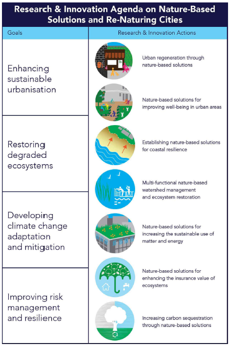 La Commissione europea ha identificato quattro obiettivi principali che possono essere affrontati con "soluzioni basate sulla natura" (NbS):
