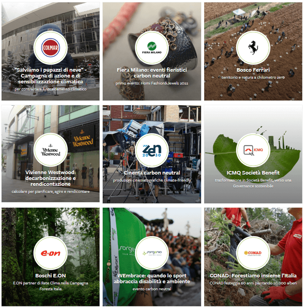 In questa logica Rete Clima sviluppa una serie di progetti ambientali aperti al sostegno delle Aziende: si tratta di progetti esteri, finalizzati a compensare la CO2 di prodotti/servizi e di Organizzazioni con crediti di carbonio generati tramite tutela e riqualificazione di ecosistemi fragili, o di progetti italiani rivolti ad incrementare e migliorare il capitale naturale italiano nell'ambito della Campagna nazionale Foresta Italia o a stoccare carbonio nei suoli e soprassuoli agricoli ("carbon farming"):