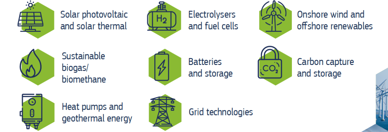 In cima alla lista troviamo le rinnovabili – solare fotovoltaico e termico, turbine eoliche onshore e offshore - gli elettrolizzatori per l’idrogeno e le celle a combustibile, le batterie, le pompe di calore e l’energia geotermica, le tecnologie di miglioramento della rete. Nell’elenco sono inclusi anche i sistemi di cattura e stoccaggio dell’anidride carbonica (CCS) e il biometano.