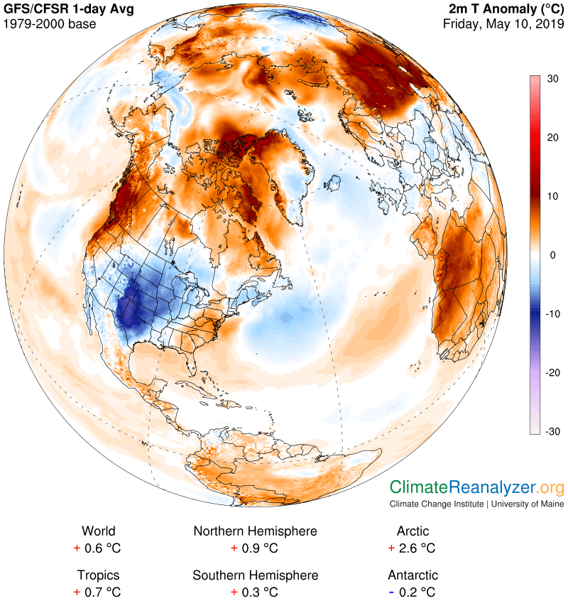 Se qualcuno in Italia peraltro si chiedesse "dov'è finito il riscaldamento climatico di Maggio" può osservare l'immagine a seguito, estratta dal sito Climatereanalyzer che mostra la situazione termica globale di questi giorni con anomalie termiche positive presenti in larghe parti del Mondo: