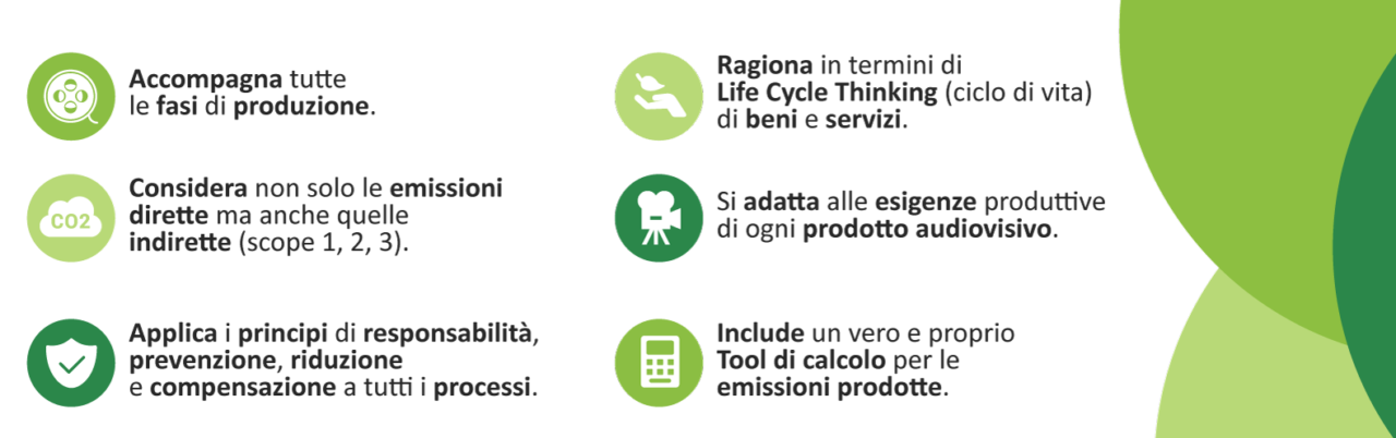 Il protocollo è stato sviluppato in due moduli complementari rivolti rispettivamente: all’eco-progettazione dei set cinematografici, riducendo a monte le emissioni di gas serra rispetto ad uno scenario di riprese “ordinarie” (cioè senza particolari attenzioni ambientali); al calcolo delle emissioni residue al fine di una loro successiva neutralizzazione, al fine di rendere la produzione a zero emissioni.