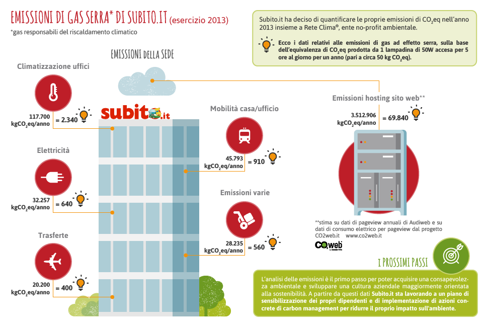 Data la specifica attività operata da Subito.it sul web, è stata sviluppata anche una specifica contabilità analitica delle emissioni di CO2eq del portale web aziendale www.subito.it mediante i tool del Progetto CO2web, il portale di Rete Clima dedicato alla quantificazione e compensazione delle emissioni di gas serra dei siti web: