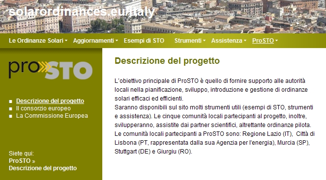 C’è un interessante progetto cofinanziato dalla Commissione Europea (Progetto ProSTO), finalizzato a fornire sostegno degli enti locali per la pianificazione, lo sviluppo, l’introduzione e la gestione di "ordinanze solari" (cioè di obblighi di installazione del solare termico negli edifici). Si tratta di un progetto che si propone di realizzare esperienze pilota che possano essere copiate dalle municipalità di tutta Europa: una sorta di guida per aiutare gli enti locali a promuovere il solare termico con ordinanze ad hoc come quelle sui regolamenti edilizi, in tutti i passi necessari per tali attività.