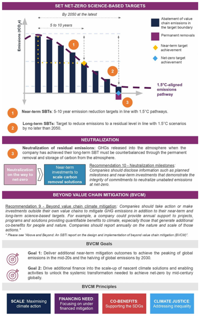 Attraverso le linee guida contenute nel documento Corporate Net Zero Standard, SBTi fornisce un rigoroso approccio metodologico in accordo con la più recente scienza climatica che prevede in via massiccia e prioritaria la riduzione delle emissioni aziendali secondo Scope 1, 2 e 3 in un orizzonte di breve e lungo termine, ed in via secondaria, la necessità di compensare l'impatto di eventuali emissioni serra residuali tramite l’uso di crediti di carbonio.