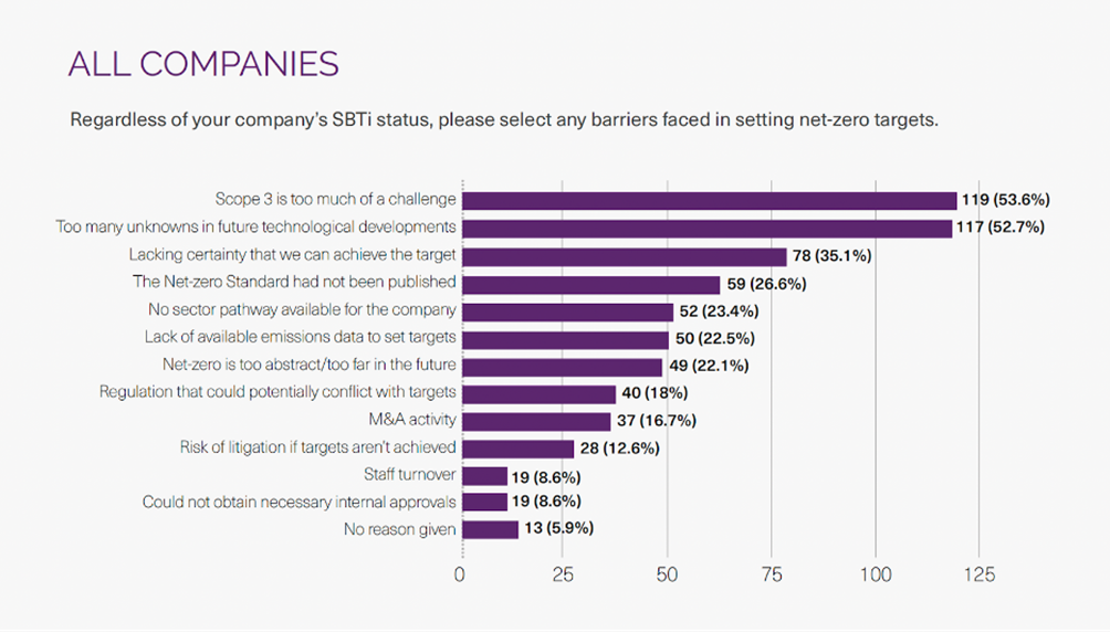 Non a caso, nel recente report di SBTi nel quale sono state intervistate 971 aziende partecipanti al programma, l’abbattimento delle emissioni di Scope 3 è stato indicato come il principale ostacolo per il raggiungimento degli obiettivi Net-Zero (53,6 % dei rispondenti).
