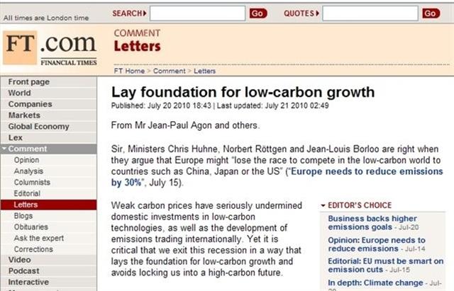 In un altro intervento, sempre pubblicato sul "Financial Times" lo scorso 15 luglio, il Ministro britannico dell'Energia (e dei Cambiamenti Climatici) Chris Huhne, il Ministro tedesco dell'Ambiente Norbert Roettgen ed il Ministro francese dell'Ecologia Jean-Louis Borloo avevano incitato la UE a ridurre del 30% rispetto ai livelli del 1990.