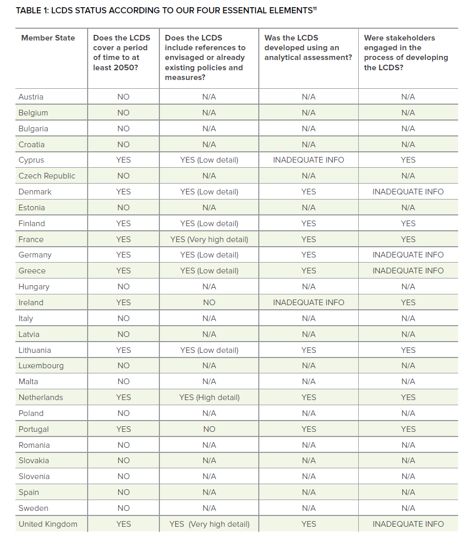 Il report analizza le politiche climatiche degli 11 Stati europei che hanno effettivamente realizzato e consegnato all’UE entro il 2015 la propria strategia nazionale di decarbonizzazione, con orizzonte al 2050: tra questi Stati non compare l’Italia, che non è quindi stata valutata, dal momento che il nostro Paese aveva presentato (come Strategia di decarbonizzazione al 2050) solo la precedente Strategia energetica nazionale al 2020, approvata nel 2013 dai (soli) Ministero dello Sviluppo Economico e dal Ministero dell’Ambiente, inserendo nella versione finale un breve capitolo sulle prospettive al 2050 che il rapporto dell WWF definisce come un "generico elenco di desideri più che una strategia".