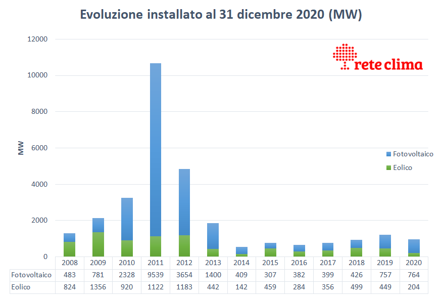 Purtroppo, venuti meno gli incentivi, negli ultimi sette anni la potenza FER installata è calata dalla media annuale di 5,9 GW del triennio 2010-2013 all’attuale 0,8 GW (2020): si tratta di un valore ben al disotto della media dei 4 GW previsti dal PNIEC per il raggiungimento degli obiettivi di decarbonizzazione al 2030.