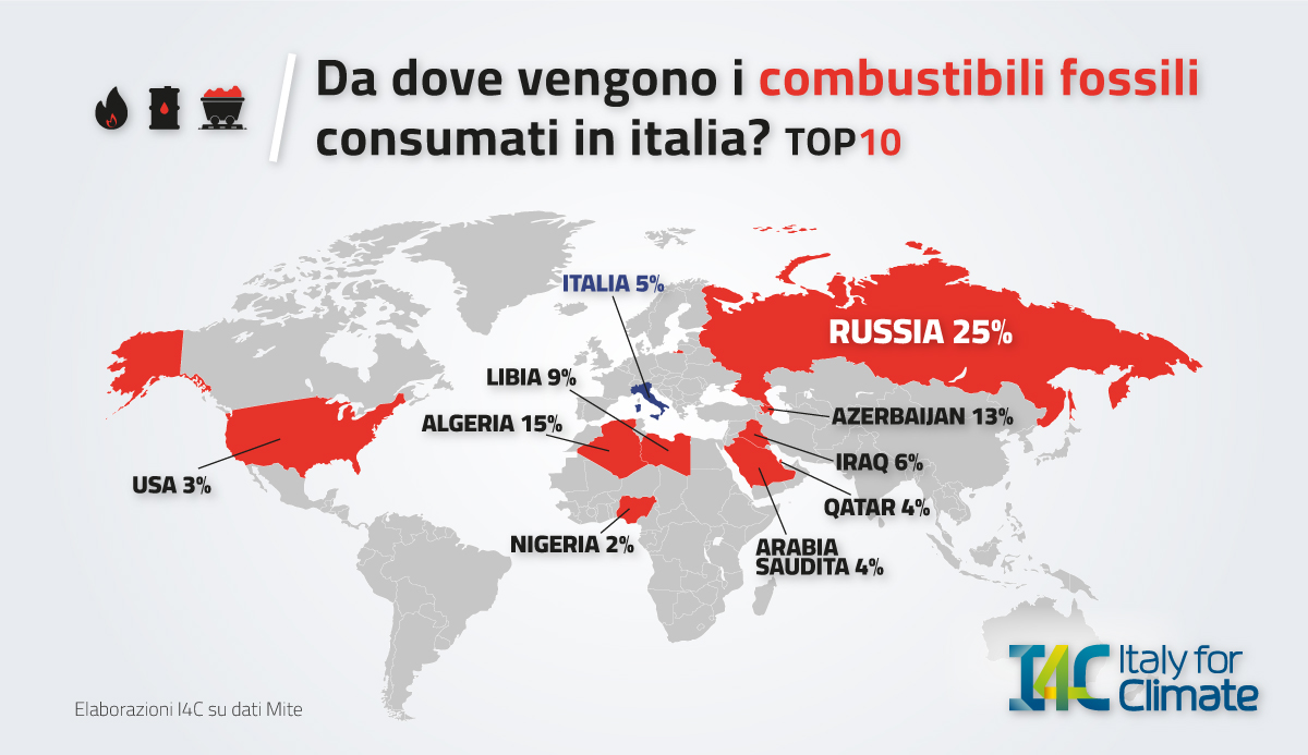 Il 25% di tutti i nostri consumi di energia fossile dipendono proprio dalla Russia: dalla Russia importiamo non solo gas, ma anche petrolio e carbone.